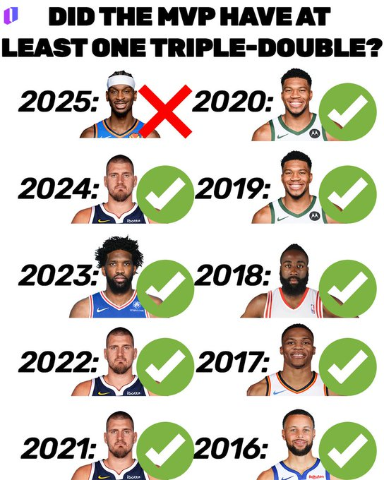 “疯狂但真实,自2015年以来,SGA是唯一一位在当选MVP的赛季中未曾达成三双的球员。”